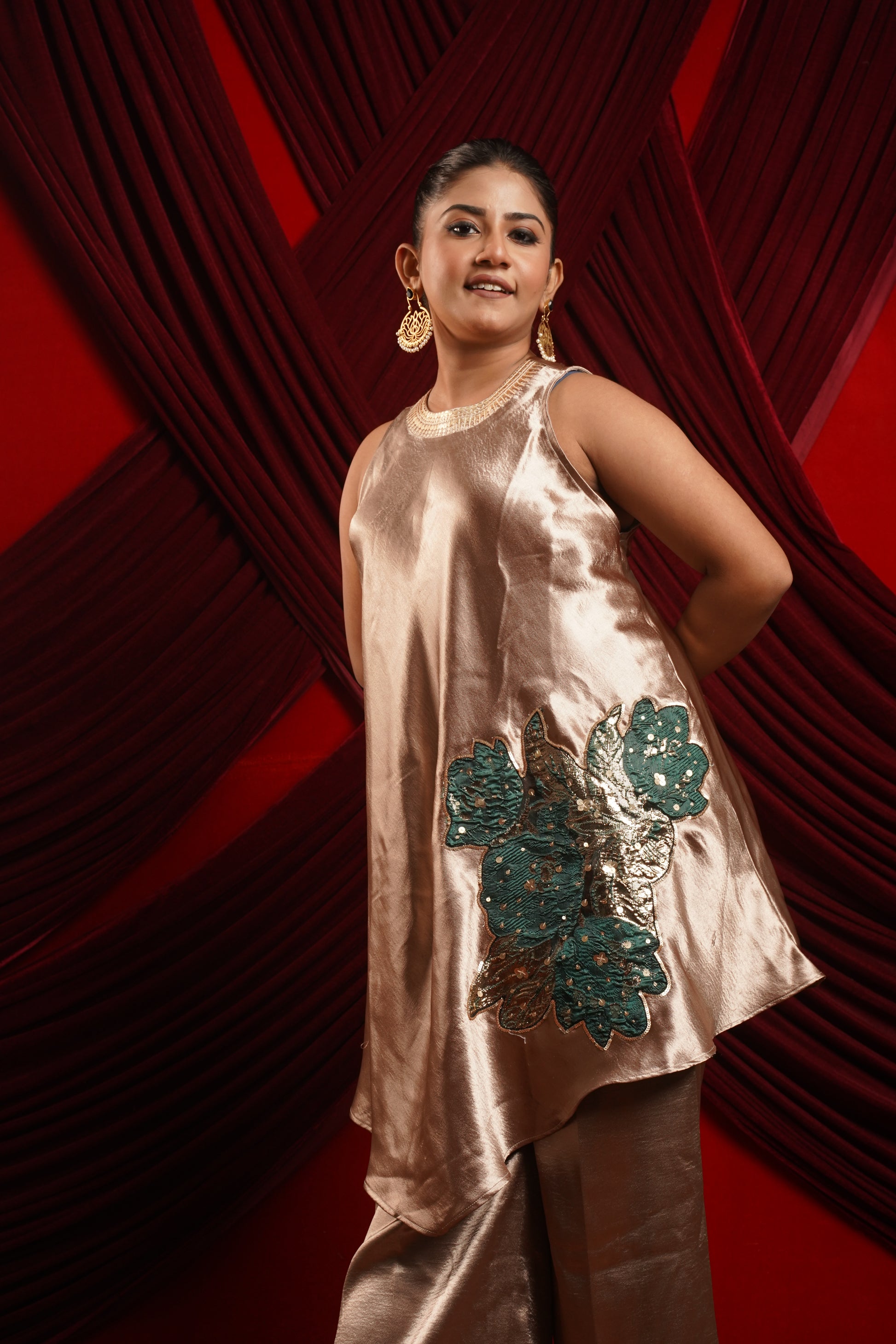 • Details : bias incut top with sequined neckline and appliqued patched tunic with straight bottoms